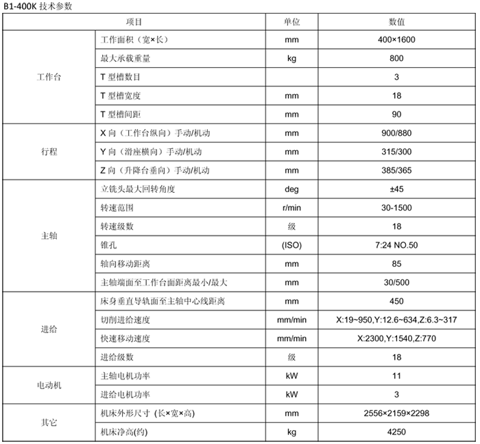 B1-400K 立式升降臺銑床是我廠原X53k基礎(chǔ)上的改型產(chǎn)品。X53k曾榮獲機(jī)械工業(yè)部頒發(fā)的 “質(zhì)量信得過產(chǎn)品”稱號。該產(chǎn)品結(jié)構(gòu)可靠、性能好、質(zhì)量穩(wěn)定、操作方便,適用于各類機(jī)械加工,可加工各種平面、溝槽、齒輪等。配置圓工作臺、分度頭等銑床附件,可進(jìn)一步擴(kuò)大機(jī)床的使用范圍。