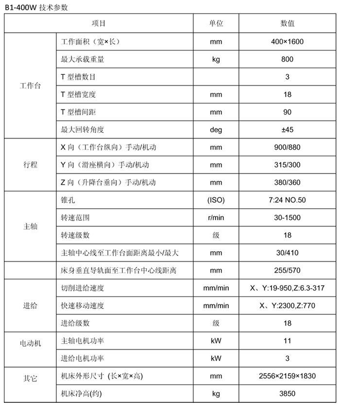 B1-400W 萬能升降臺(tái)銑床是我廠原X63w基礎(chǔ)上的改型產(chǎn)品。X63w曾榮獲機(jī)械工業(yè)部頒發(fā)的“質(zhì)量信得過產(chǎn)品”稱號。該產(chǎn)品結(jié)構(gòu)可靠、性能好、質(zhì)量穩(wěn)定、操作方便,適用于各類機(jī)械加工,可加工各種平面、溝槽、齒輪等。配置萬能銑頭、圓工作臺(tái)、分度頭等銑床附件,可進(jìn)一步擴(kuò)大機(jī)床的使用范圍。