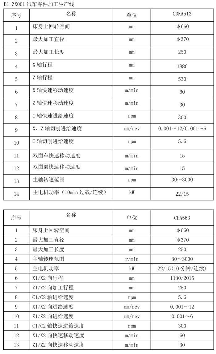 汽車零件加工生產(chǎn)線 B1-ZX001汽車零件加工自動生產(chǎn)線是主要用于汽車剎車盤、剎車轂加工行業(yè)使用的生產(chǎn)線。該生產(chǎn)線具有高精度、高效率、高可靠性和高柔性自動化加工的特點,能夠?qū)崿F(xiàn)剎車盤自動裝夾,完成粗車、精車、銑削、鉆孔、攻絲、鏜孔、雙面車、雙面磨功能,并采取了多項物流機構(gòu)上工件位置的可靠性檢測手段,實現(xiàn)了工件從毛坯到成品的全自動化加工過程。該生產(chǎn)線由1臺CHA563 立式復(fù)合車削中心、1臺CDKA513A 數(shù)控倒立車床和1套自動化物流傳送機構(gòu)串聯(lián)組成,可以滿足目前市場上流行的大部分剎車盤加工的需求。在物流機構(gòu)上增加上料、下料機械手,可以實現(xiàn)整個加工過程無人化操作,滿足現(xiàn)代化加工的需求。