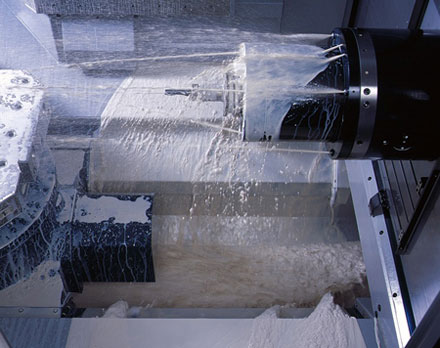 高速加工的高生產(chǎn)率所帶來的切屑量是驚人的。為了確保切屑可靠去除,加工室里的擋板幾乎呈垂直的構(gòu)造,切屑與主軸頭部和頂部噴出的冷卻液一起流入工作臺正下方寬敞的中心切屑槽內(nèi),將與冷卻液一起被沖刷到機(jī)身外部。附帶過濾功能的提升排屑器,能確保始終供應(yīng)清潔的冷卻液。